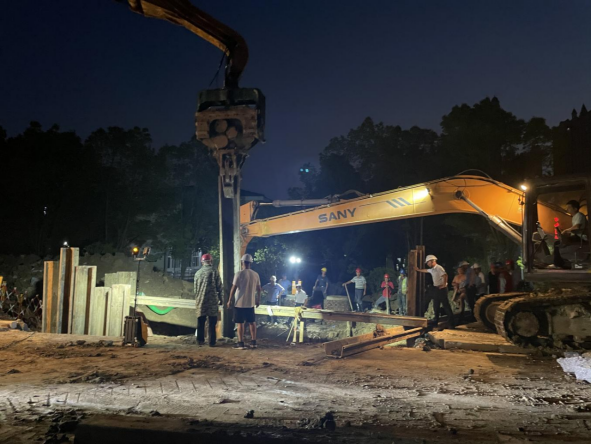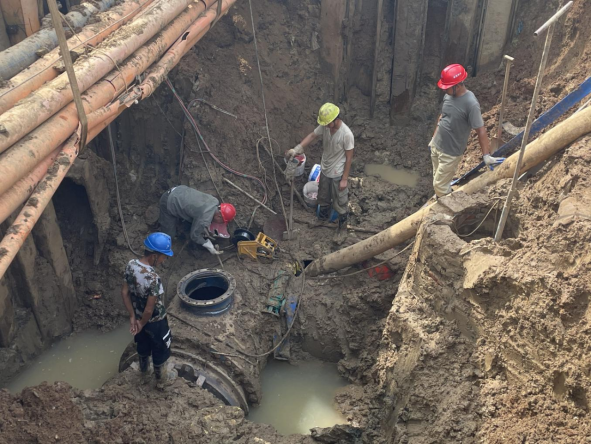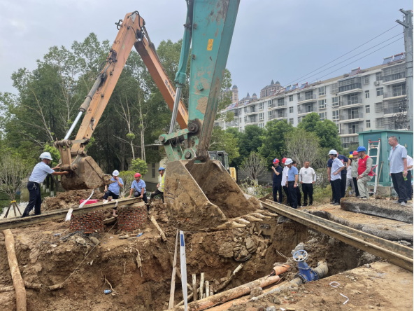 晚上9点,公司第一时间派出10余名抢修人员迅速到场关闸止水,三水厂暂停供水。与此同时,技术人员、施工人员和设备设施“跑步前进”、同步到场,对破损溢水点进行边开挖、边诊断。由于情况复杂,晚上24点,3台大型挖机、桩机进场,20余人到场增援,清理作业面。市政府组织市住建局、澴川国投、供电公司、燃气公司即刻组成技术专班,会同公司技术人员和一线工人现场制定抢修方案。