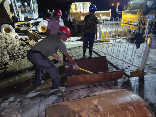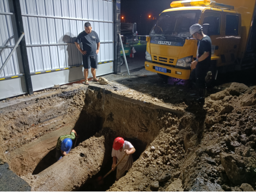 在快速挖开路面找出供水主管道后,经技术人员现场分析判断,确定此次DN600供水主管道被施工损坏是因孝武大道道路改造施工导致,其施工人员操作啄木鸟时不慎将水泥供水管道挖破。随后技术人员迅速制定了维修方案,即采用DN800钢管抱箍,快速水泥填充的方式修复。为缩减抢修时间,运行维护部共派出各类工程车辆5辆,抢修人员18名参与到此次抢修任务中。尽管已到深夜,气温仍接近30摄氏度,但抢修人员不顾疲劳和炎热,抢时间、赶进度,通宵作战,终于在11日早上6点完成抢修任务,顺利通水。
