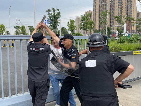 此次演练模拟一名“持械可疑人员”翻墙进入水厂厂区,企图对水厂供水设施进行破坏或实施投毒,门卫保安人员经过劝说阻拦后,外来人员突然从背包里拿出管制刀具发难,要暴力冲卡,保安人员见状一边与歹徒周旋,一边通知供水生产部及应急安全部。