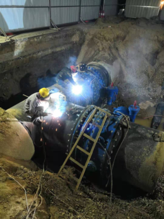 凌晨一点,施工作业车辆正在对原有内径为1.4米的水泥管道进行破除,待余水放完之后,将会与新的内径为1.6米的改迁管道进行碰头连接。为尽快完成施工,公司分班组对两处碰头连接工程进行同步实施,电焊工和机械操作人员随时待命,通宵作业。